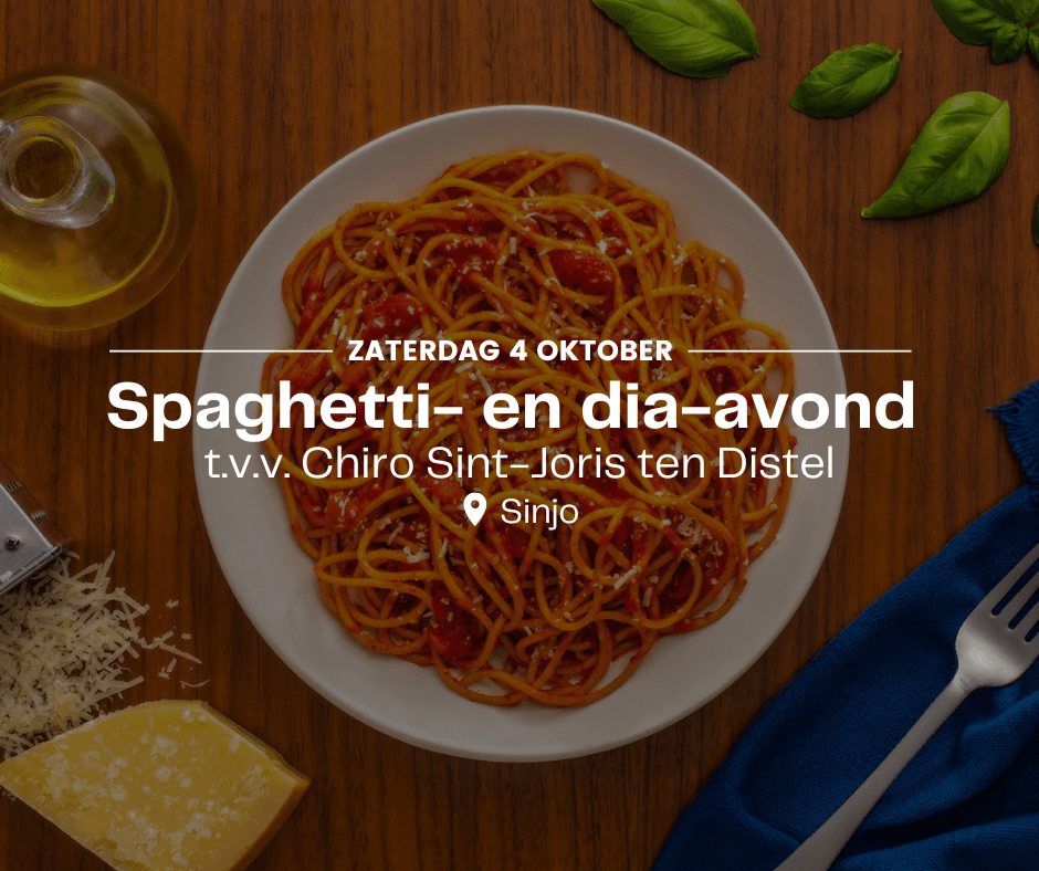 . Op zaterdag 4 oktober zijn jullie allen welkom in de Sinjo. Vanaf 19u kan je zoveel spaghetti komen smullen als je wil (à volonté!), terwijl de kampfoto’s op groot scherm passeren.
